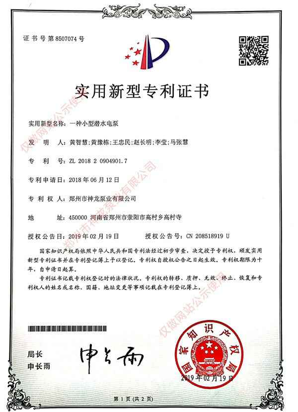 小型潜水泵专利证书